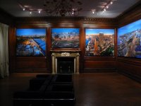 In addition to the dizzying beauty of the views chosen, this series shows the painter reflecting on solutions to the spatial problems a given site poses. This reflection on space includes, for Doura, how to exhibit the paintings, their ’installation.’ The entire series fits into the library room of the Argentine Consulate in New York (for which the paintings were designed). Each painting format fits exactly into the woodwork moldings. The canvases are hung so that the horizon or ’skyline’ (the line of contact of buildings with the sky) travels around the four walls at the same height (except for the painting placed over the mantelpiece). As the viewer enters the room, he is immediately surrounded by open views of the city, with the feeling of ’floating’ in the midst of a panoramic cityscape.