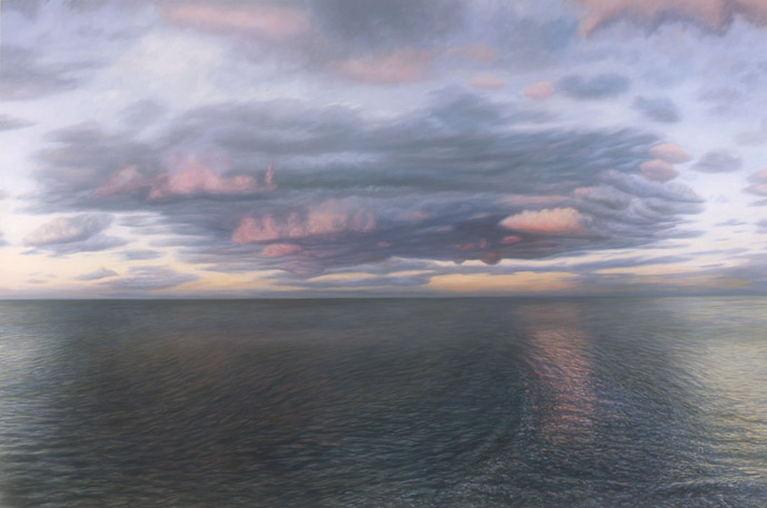 Face à la nature, à l’affirmation de l’immensité, à la brutale transition chromatique des soleils couchants, à la force des éléments, la peinture saisit la légèreté de l’onde de l’air qui nous enveloppe dans ces subtils instants.